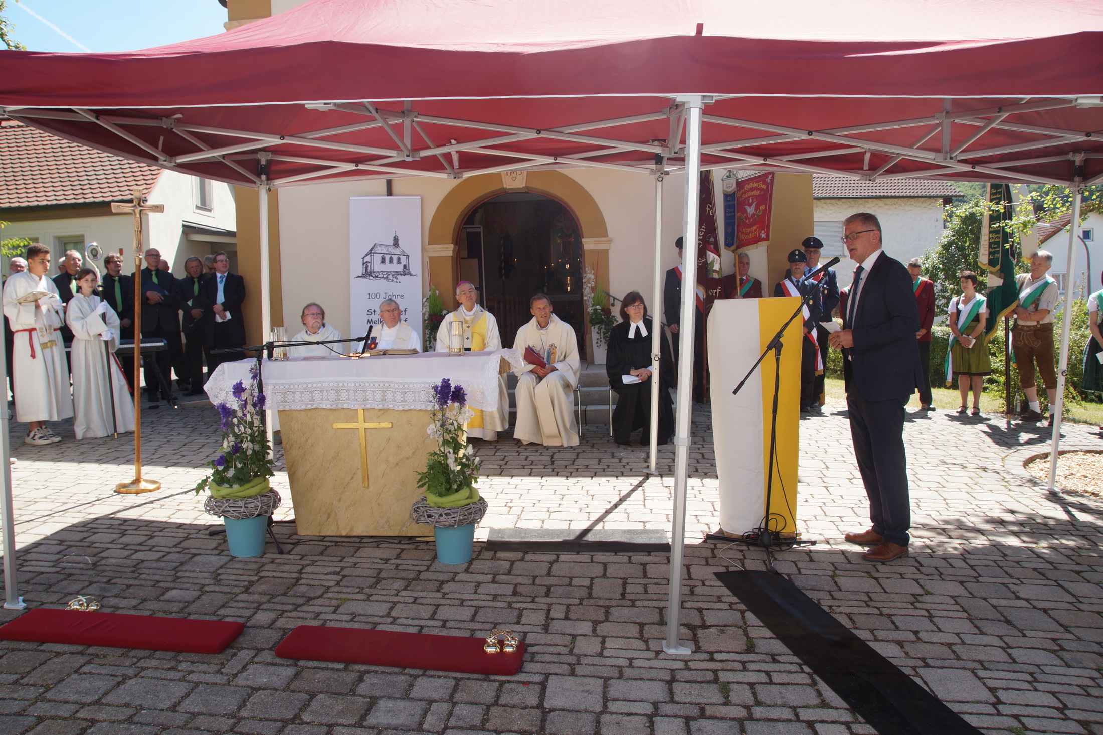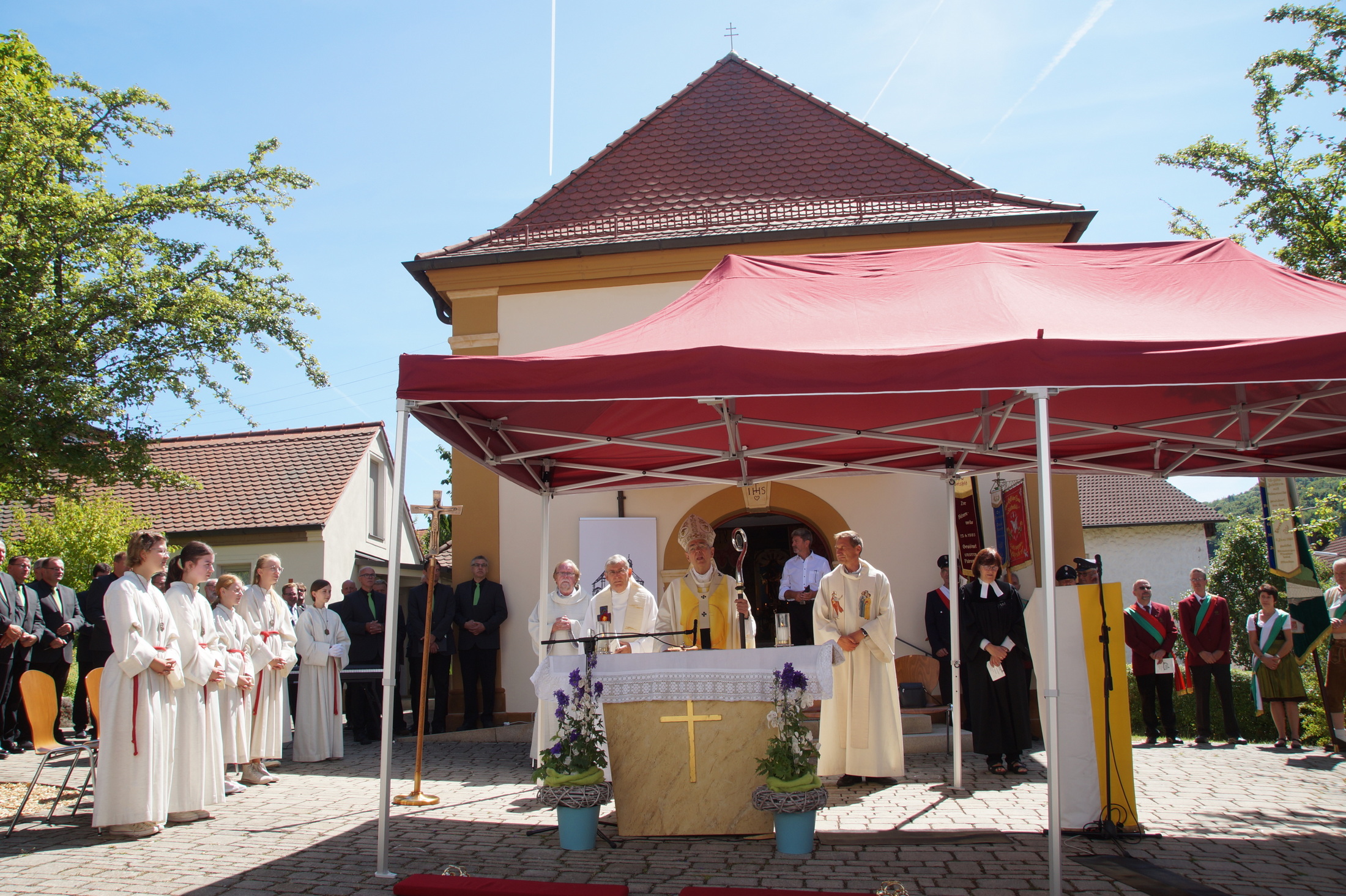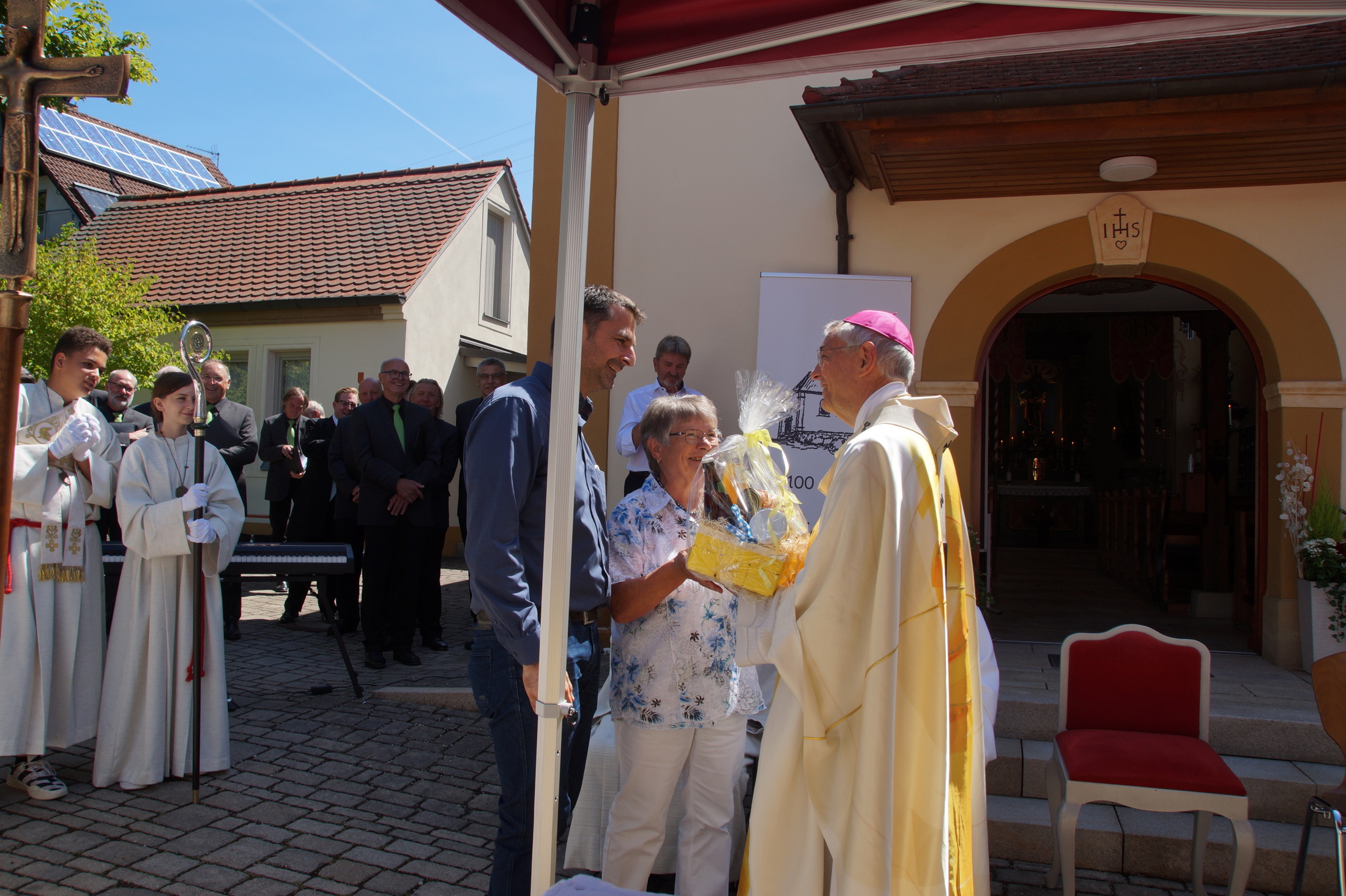Das Kommunionkind Samuel Dorscht begrüßte seine Exzellenz im Namen aller Gläubigen. Da die kleine Kapelle die vielen Gläubigen nicht fassen konnte, wurde der Gottesdienst außerhalb gehalten und auch per Livestream direkt gesendet.